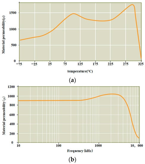 where μ represents the permeability, N is the number of turns of the coil, Afe is the cross-sectional area of the core, l is the length of the magnetic circuit, and the only parameter that can be changed after the inductor is made is the permeability μ. Therefore, the inductance value changes with the change of permeability. For example, Figure 4a shows the relationship between the permeability of a company’s material and temperature change, and Figure 4b shows the relationship between permeability and frequency change.