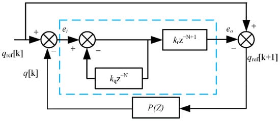 The traditional deadbeat direct power control strategy does not consider the influence of system control frequency variation. In order to solve this problem, the influence of frequency on the system is regarded as periodic error, and the error of the last fundamental period is stored by repeated control, and the waveform is corrected at the appropriate moment of the next fundamental period so as to ensure the output waveform quality in steady state. The block diagram of instantaneous power control based on repeated signal generator is shown in Figure 5. The repeated controller adopts quasi-integral kqz−N, where kq is the quasi-integral coefficient. In order to ensure the stability of the system, 0 < kq < 1 is generally taken. In this paper, kq = 0.95 is taken, and N is the sampling times in a fundamental wave period. In krz−N + 1, z−N is the kr times of the error integral at the same sampling time of the previous fundamental wave period superimposed to the current fundamental wave period, which is used to compensate the predicted value of the fundamental wave period.
