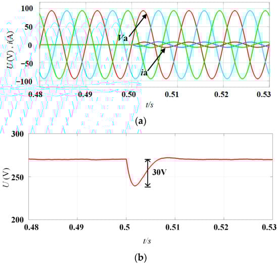 Figure 10a shows the steady-state waveform of the three-phase grid voltage and input current under the condition of 72.9 Ω resistance load. According to the simulation results, the input current of each phase is basically consistent with the corresponding input voltage phase, and the unit power factor operation of the PWM rectifier is realized. In addition, in order to verify the method of dynamic characteristic, for PWM rectifier from no-load (load end open circuit) to 1 kw resistive load test. The simulation results of Figure 10b can be seen that the DC side voltage drops close to 30 V when the load changes. After 0.014 s, it returns to the steady state. The voltage fluctuation is basically zero and the fluctuation amplitude is 0.5 V, which has a high accuracy and a fast response speed.