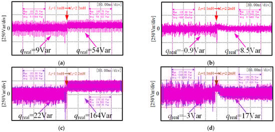 Comparison of reactive power variation under different frequency when inductance changes suddenly: (a) Inductance change of traditional control scheme at 100 Hz; (b) Inductance change of proposed control scheme at 100 Hz; (c) Inductance change of traditional control scheme at 400 Hz; (d) Inductance change of proposed control scheme at 400 Hz.