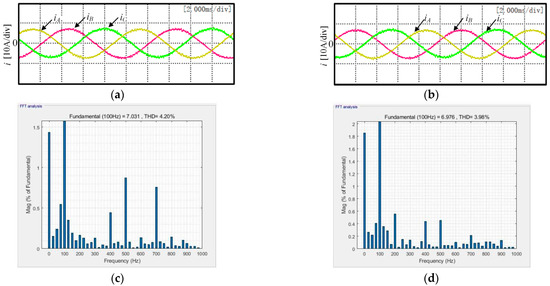Comparison of three-phase current waveforms and THD: (a) the three-phase current waveform of the conventional deadbeat direct power control; (b) the three-phase current waveform of the proposed scheme; (c) THD of conventional deadbeat direct power control current; (d) THD of proposed scheme current.