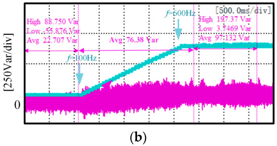 Figure 13 shows the DC side voltage and reactive power change waveform when the frequency rises in a ramp form. To further simulate the operation of the actual working conditions, according to the aircraft electric characteristic standard MIL-STD-704, the three-phase AC voltage frequency changes from 100 Hz to 600 Hz at 250 Hz/s. The blue curves in Figure 13a,b indicate the change in frequency. The average reactive power value of the proposed scheme at 100 Hz is 40% of the conventional deadbeat direct power control scheme, and the average reactive power is reduced by 33 Var compared to the conventional method. The amount of reactive power fluctuation is 69.2% of the conventional scheme. After a frequency change to 600 Hz, the average reactive power value of the proposed scheme is 51.2% of that of the conventional method, which is 92 Var lower than the average reactive power value of the conventional method—54.3% of the reactive power fluctuation of the conventional scheme. In the interval where the frequency changes, the experimental results compare only the average values, as the maximum and minimum values of reactive power are always changing. In the interval where the frequency varies, it can be observed that the reactive power can be reduced to 52.1% of the conventional method using the proposed method. Therefore, the overall power factor of the proposed scheme is higher in a steady state, and the overall fluctuation is less stable. This experiment can verify that the proposed method has the advantages of a high power factor and a high stability