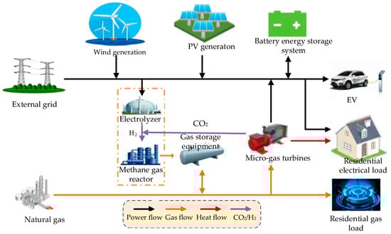 The core unit of power-to-gas technology is an electrolyzer, which produces oxygen and hydrogen by electrolyzing water, after which the methane reactor absorbs carbon dioxide to produce methane through catalysis, with the following chemical reactions []: