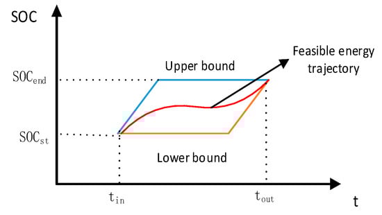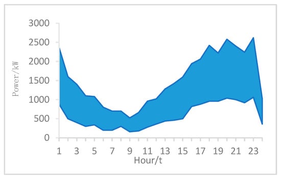 - Electric vehicle charging power constraintDividing a day into 24 time periods, the total load demand for time period t is the sum of all EV charging loads, and the total charging load is:where M represents the total number of electric vehicles that the charging power should satisfy, is the charging power of the m-th car in the i-th time period, and Pev,t is the total charging power of all cars in the i-th time period. Therefore, the charging power should meet the following:The charging power should also meet the dispatchable potential of the electric vehicle cluster.