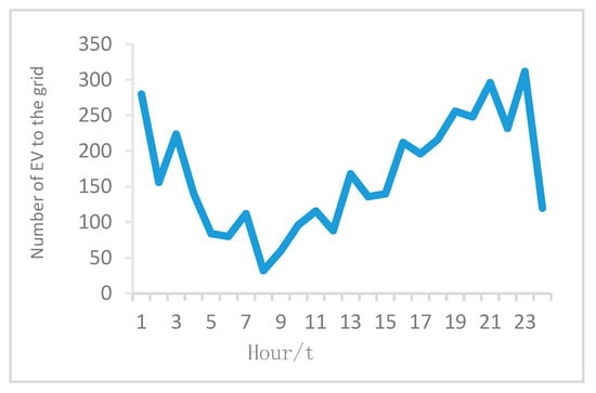 The EV charging process has a dispatchable potential, as shown in Figure 2. The charging energy trajectory between the upper energy boundary and the lower energy boundary is the feasible energy trajectory, and the area between the upper and lower boundaries is the dispatchable potential of a single EV. By aggregating groups of EVs, a huge dispatchable potential can be obtained. Taking 1000 EVs as an example, based on the probability density distribution of the daily driving distance and return time of the EVs, the initial SOC of the EVs and the time distribution of the EVs connected to the grid can be obtained by drawing samples through the Monte Carlo method, as shown in Figure 3 and Figure 4, respectively, and then the adjustable potential of the EV population can be obtained, as shown in Figure 5.