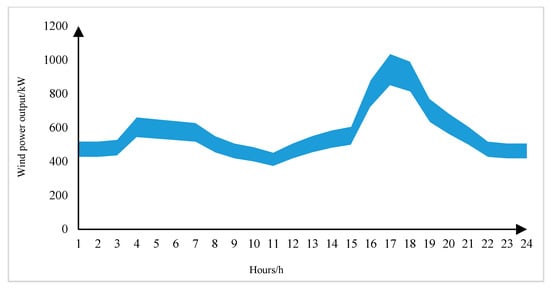 where PWPP is the wind power output, kW, Prated is the rated wind power, kW/h, and vin, vout, and vrated are the cut-in wind speed, cut-out wind speed, and rated wind speed, m/s, respectively.