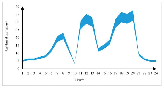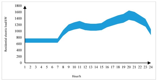 where Pev,t denotes the electric vehicle charging power at time t, Pload,t denotes the residential load power at time t, kW, and denote the energy interaction power between the virtual power plant and the grid and the natural gas network at time t, respectively, and , , , and denote the purchase/sale price of gas from the virtual power plant to the natural gas network and the grid at time t, respectively.