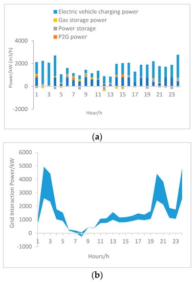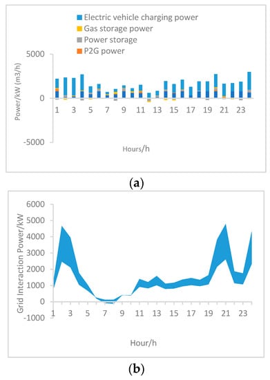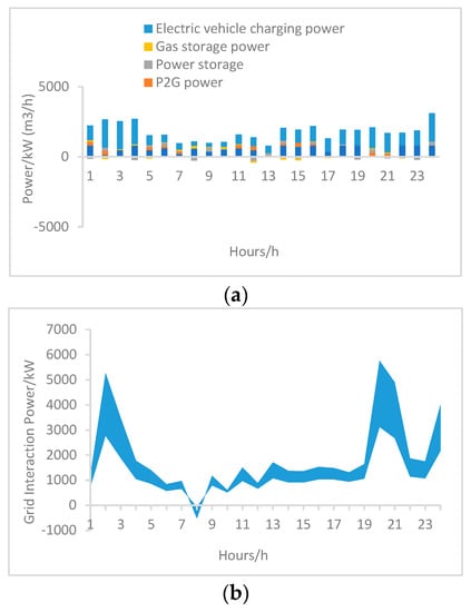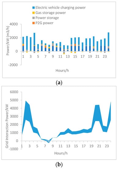 - Each device has its own upper and lower limits of operating power, and can only operate properly if it is kept within these limits. The power constraints for each device are as follows:where: and are the upper and lower limits of gas turbine power generation, respectively, and are the upper and lower limits of power-to-gas equipment power, respectively, and are the upper and lower limits of electric vehicle charging power, respectively, and are the upper and lower limits of charging and discharging power of electric storage equipment, respectively and , , , and are the upper and lower limits of gas storage/discharge rate, respectively.