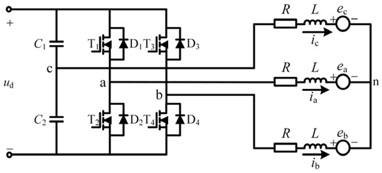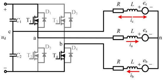 where, ud is the DC bus voltage, uC2 is the voltage on capacitor C2, Sa(t), Sb(t), Sc(t) represent the state of the inverter’s three-phase bridge arm power transistor, Sk(t) = 1 (k = a,b,c) represents the upper bridge arm power transistor open, Sk(t) = 0 (k = a,b,c) represents the lower bridge arm power transistor open.