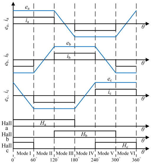 The ideal back EMF, phase current, and Hall signal of a BLDCM are shown in Figure 2, where θ is the rotor’s electrical degree. Under ideal conditions, the back EMF is the trapezoidal wave, and the phase current is the square wave. According to the relationship between the back EMF and the phase current, one electrical cycle of the BLDCM driven by FSTPI can be divided into six operating modes. Each operating mode is 60 electrical degrees. As can be seen from the figure, the back EMF zero crossing point of BLDCM is ahead of the next commutation point by 30 electrical degrees.