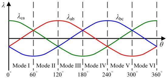 It can be seen from the formula that the line-to-line PM flux linkage of a BLDCM is numerically equal to the integral of the motor line-to-line back EMF. The line-to-line PM flux linkage with the rotor position waveform is shown in Figure 3. It can be seen from the figure that the amplitude of line-to-line PM flux linkage of the BLDCM is equal, and the phase difference of line-to-line PM flux linkage is 120 electrical degrees. Moreover, the line-to-line PM flux linkage zero crossing point is 30 electrical degrees ahead of the next commutation point.