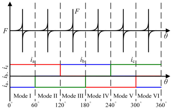 From the above analysis, we know that the functions F1, F2, and F3 change slowly at the beginning of each operating mode and change quickly as λ approaches zero. This feature is very beneficial for the detection of commutation points. Since the function has two extremum jump moments in each electrical cycle of the motor, each function can provide two commutation signals in one electrical cycle. Since the BLDCM needs six commutation signals during operation, the controller can use the F1 function, F2 function, and F3 function to detect the extremum jump moment in different operating modes. In turn, the controller delays the extremum jump moment by 30 electrical degrees to obtain the next commutation point. According to the different commutation points required in each operating mode, the corresponding flux-linkage functions for each operating mode of the BLDCM driven by FSTPI can be obtained, as shown in Table 2.