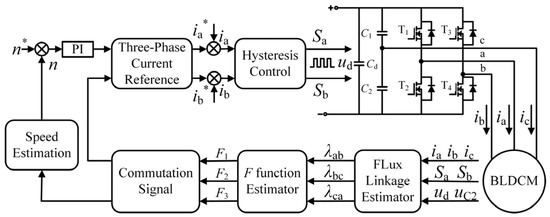 In Figure 7, the controller obtains the reference current for each operating mode of the BLDCM driven by FSTPI according to the motor commutation signal and Table 2. The controller regulates the motor speed and current by controlling the a-phase and b-phase currents as reference currents through a hysteresis loop control. In each operating mode, the controller obtains the motor terminal voltage based on the collected DC bus voltage, capacitor voltage, and the switching signals of the upper and lower bridge arm power transistors in a-phase and b-phase provided by the hysteresis controller and calculates the flux-linkage function from the line to line voltage and the three-phase current. Then the controller selects different flux-linkage functions as the basis for commutation according to the different operating modes of the FSTPI and obtains six commutation points of the motor by delaying the extremum jump moment of the flux-linkage function by 30 electrical degrees. Finally, the controller can implement the motor commutation control based on the estimated commutation signal.