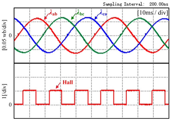 In order to verify the correctness of the theoretical analysis in this paper, the experimental use of the calculation method proposed in this paper obtains the line-to-line PM flux linkage. The experimental waveform of the line-to-line PM flux linkage and the Hall signal at the experimental motor at 300 r/min speed is shown in Figure 9.