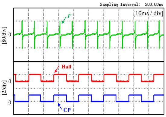 Figure 9, from top to bottom, shows the line-to-line PM flux linkage and the Hall signal. Each edge of the Hall signal represents a commutation point detected by the Hall sensor. From the experimental waveform diagram, we can see that the waveform of the line-to-line PM flux linkage is consistent with the theoretical analysis, its zero crossing point at the middle moment of the two commutation signals, and its delay of 30 electrical degrees can correspond exactly to the commutation signal.
