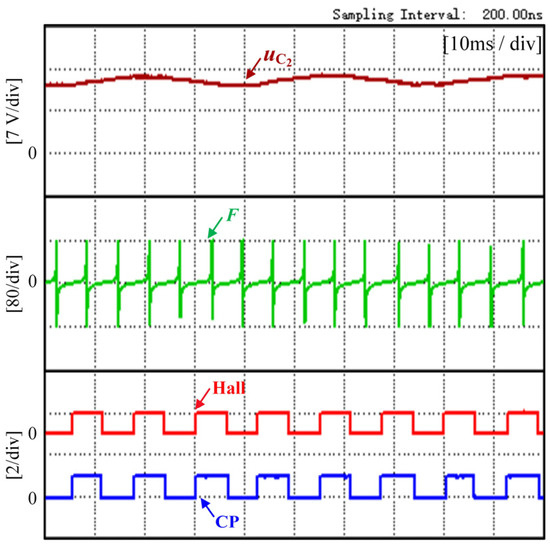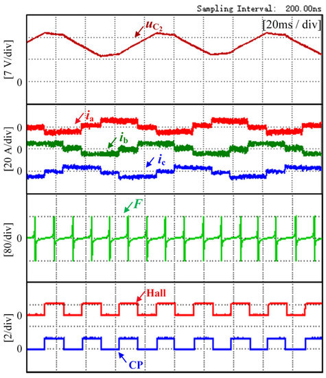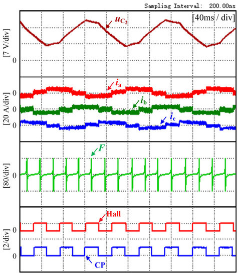 Figure 10 shows the experimental waveform at 300 r/min speed and 1 N·m torque. Figure 11 shows the experimental waveform at 300 r/min speed and 0.5 N·m torque. The voltage across capacitor C2, the three-phase current, the flux-linkage function, the Hall signal, and the commutation signal CP are shown from top to bottom in Figure 10. In the experiment, the controller gets the commutation point by detecting when the flux-linkage function changes from positive to negative polarity and delaying 30 electrical degrees.