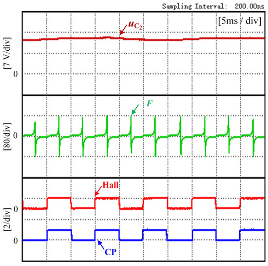 The capacitor voltage of the BLDCM driven by FSTPI will fluctuate more seriously at low speeds and heavy loads, which is very unfavorable to motor operation. To make the control performance of the motor better, the experimental waveforms at lower speeds in this experiment are shown in Figure 12 and Figure 13. Figure 12 shows the experimental waveform at 200 r/min speed and 0.8 N·m torque. Figure 13 shows the experimental waveform at 100 r/min speed and 0.5 N·m torque.