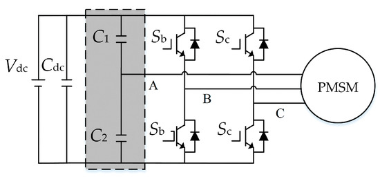 The topology of the TPFS inverter-fed PMSM drive system is shown in Figure 1. The system consists of an input DC source, a DC-link capacitor, a one-phase capacitor bridge arm, a two-phase controllable power switch devices bridge arm, and a PMSM. In this paper, the phase A motor is studied as an example connected to the midpoint of the capacitor bridge arm.