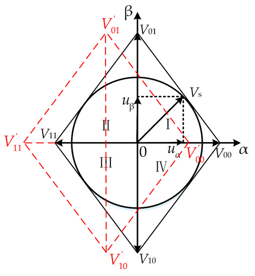 From Equation (6), it can be seen that the reference voltage uα generates an offset of −2ΔV/3 and the reference voltage uβ remains unchanged, so only 2ΔV/3 needs to be compensated on the reference voltage uα to obtain the corrected α-axis reference voltage. The corrected αβ-axis reference voltage expresses as