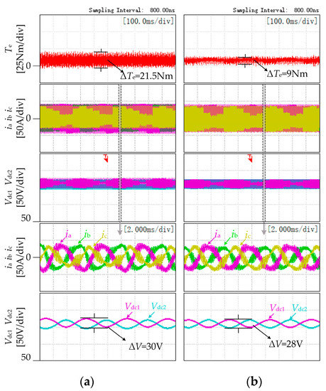 Figure 5 shows the experimental waveforms at the speed 2500 r/min and the load 10 Nm. From the top to the bottom is the motor torque Te, three-phase current ia ib, ic, capacitor voltage Vdc1 and Vdc2, the amplification waveforms of three-phase current, and the amplification waveforms of capacitor voltage are shown, respectively. Figure 5a shows the experimental waveforms without capacitor voltage offset suppression. The waveforms show that the torque ripple reaches 21.5 Nm, and the three-phase current and the capacitor voltage of the TPFS inverter are unbalanced, where the capacitor voltage offset is 30 V. Figure 5b shows the experimental waveforms with the proposed method. Since the proposed method corrects the reference voltage so that the TPFS inverter synthesizes the correct reference voltage vector, the torque ripple of the proposed method is 9 Nm, compared with the experimental waveform without capacitor voltage offset suppression, which effectively reduces the torque ripple caused by the capacitor voltage offset. The three-phase current and the capacitor voltage of the TPFS inverter are balanced by the proposed method, where the capacitor voltage offset is reduced to 28 V, which effectively improves the motor control performance.