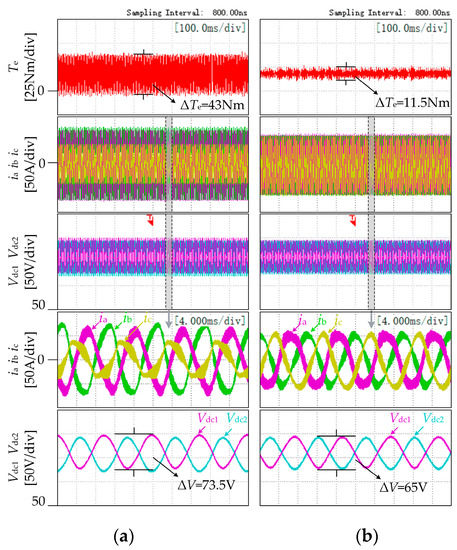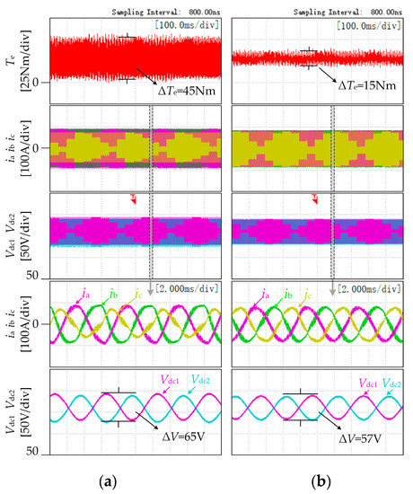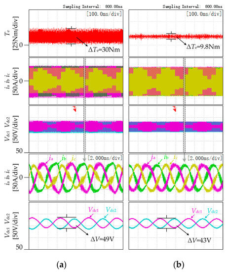Figure 6 shows the experimental waveforms at the speed 2500 r/min and the load 20 Nm, and Figure 7 shows the experimental waveforms at the speed of 2500 r/min and the load of 30 Nm. The waveforms show that the torque ripple is 30 Nm and 45 Nm without capacitor voltage offset suppression, and the three-phase current and the capacitor of the TPFS inverter are significantly unbalanced, where the capacitor voltage offset is 49 V and 65 V. The capacitor voltage offset suppression method proposed in this paper reduces the torque ripple to 9.8 Nm and 15 Nm. The three-phase current and capacitor voltage of the TPFS inverter are balanced, where the capacitor voltage offset is reduced to 43 V and 57 V. Therefore, the proposed method improved the control performance of the motor effectively.