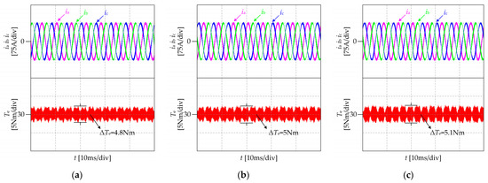 Figure 11 shows the simulation results of the proposed method when the motor running at 2500 r/min and 30 Nm operating conditions. In Figure 11, ia ib, ic is the three-phase current, and Te is the motor torque. Figure 11a–c are the simulation results for capacitor values of 2000 μF, 1500 μF, and 1000 μF, respectively. It can be seen from the simulation results that the method proposed in this paper still maintains the three-phase current balanced, and torque ripple is almost constant when the capacitor value variations.