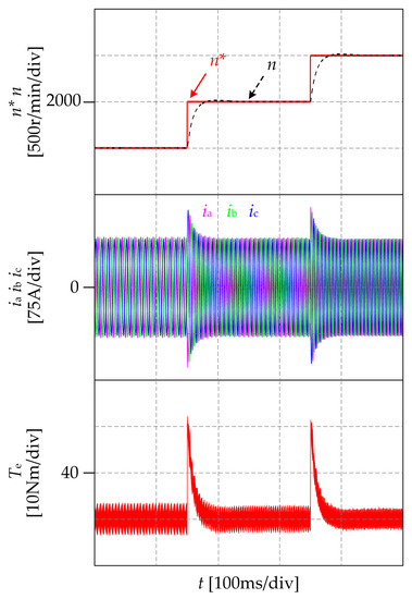 Figure 12 shows the simulation results of the proposed method during the motor speed step change with 500 r/min from 1500 r/min to 2500 r/min. In Figure 12, n* and n indicate the given motor reference speed and the actual motor speed, respectively; ia, ib, ic is the three-phase current, and Te is the motor torque. It can be seen from the simulation results that the motor will generate current and torque strikes but will soon return to normal when the motor speed is transient, and the motor actual speed can quickly track the reference speed. After the motor speed is stabilized, the three-phase current returns to balance, and the torque ripple returns to normal.