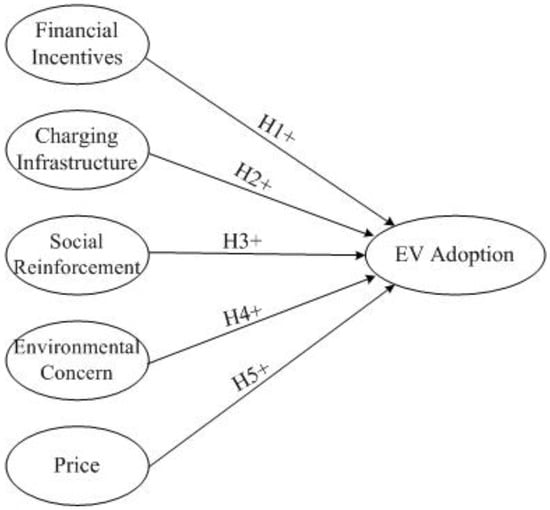 The term “social reinforcement” refers to the influence of friends, family, and neighbors on the purchasing decisions of customers. Before purchasing a product, every customer wishes to obtain consent from their friends and family members. Customers used to make purchases based on the opinions, preferences, and dislikes of family and friends [26,27]. Customers prefer to purchase products that are socially acceptable and are praised by their friends and relatives. As a result, customers decide whether or not to purchase a product [28]. Other people’s behavior has an effect on the purchasing decisions of customers. This social reinforcement is a significant factor in determining whether or not to purchase an electric vehicle [29]. Social reinforcement has an effect on the purchasing behavior and intentions of customers [30]. As a result, social reinforcement is critical for consumer adoption of electric vehicles. The following hypothesis is admissible.