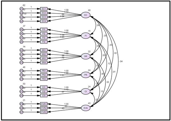 Model fit indices quantify the model’s overall fitness. The model fit indices are reported in Table 5. Confirmatory Factor Analysis (CFA) establishes the degree to which indicators accurately represent constructs. The research model’s fitness is evaluated using a variety of parameters, including the Goodness of Fit Index (GFI), the Adjusted Goodness of Fit Index (AGFI), the Root Mean Square Error of Approximation (RMSEA), the Normed Fit Index (NFI), the Comparative Fit Index (CFI), the Incremental Fit Index (IFI), and the Tucker-Lewis Index (TLI). Six fitness indices were used in this study: CMIN/df, Comparative Fit Index (CFI), Goodness of Fit Index (GFI), Adjusted Goodness of Fit Index (AGFI), and Parsimonious Normal Fit Index (PNFI) (PNFI). All CFA values are in accordance with the recommended ranges. The CFA analysis makes no recommendations for altering the overall research model.
