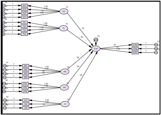 Structural equation modeling was used to test all hypotheses. Figure 2 depicts the structural model adopted for the study, while Figure 3 shows the final structural model for the current study. The primary benefit of structural equation modeling is that it enables the estimation of even more complex research models. SEM is a technique that can be used with a small sample size [46,47]. SEM is extremely beneficial when the research model is complex and there are multiple dependent variables. As illustrated in Table 6, price has a significant effect on purchase intention (p = 0.5). As a result, price has an effect on customers’ adoption of electric vehicles.