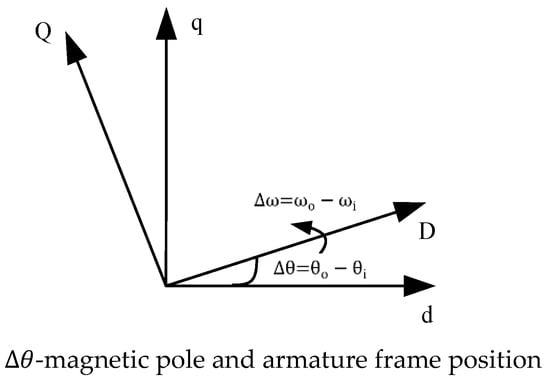 - Voltage equationwhere and represent the components of the armature winding voltage on the dq axis, represents the resistance of the armature winding, and represent the components of the armature winding current on the dq axis, and represent the components of the armature winding flux chain on the dq axis, represents the electric angular velocity of the magnetic shaft, and represents the electric angular velocity of the armature shaft.