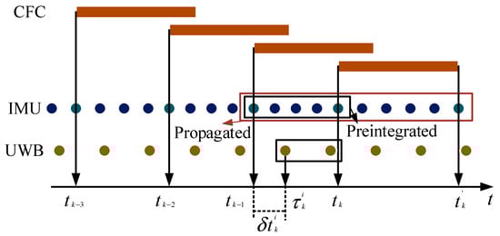 The above is the pre-integration operation on the IMU; we also need to bring the state estimation of the IMU to the current moment and the next moment. In Figure 1, we substitute the state estimation result into and to obtain the conversion and . converts to and through the correction of SCFC , CFC is obtained. In addition to the above usage, we also applied it to the relative change , where represents the time base of UWB data, and this transformation is applied to the BA process. Refer to [23] for the specific process of BA.