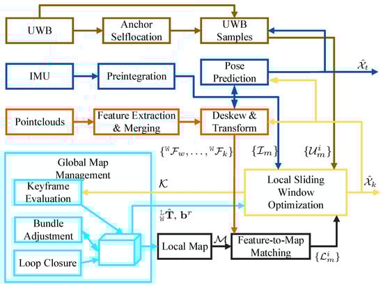 - Nguyen, T.M.; Cao, M.Q.; Yuan, S.H.; Lyu, Y.; Nguyen, T.H.; Xie, L.H. LIRO: Tightly coupled lidar-inertia-ranging odometry. In Proceedings of the 2021 IEEE International Conference on Robotics and Automation (ICRA), Xi’an, China, 30 May–5 June 2021; pp. 14484–14490. [Google Scholar]