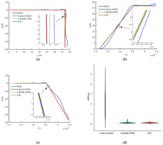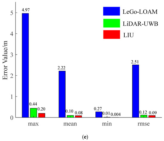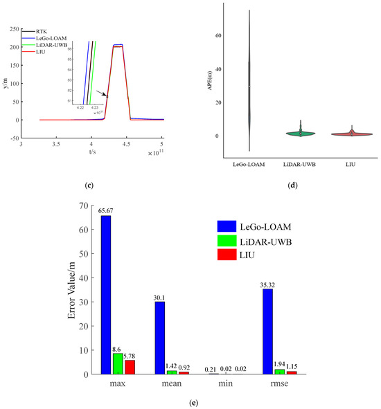 The environment used in this research is a mine roadway, but because the equipment used has not been subjected to explosion-proof treatment for the time being, this paper adopts the simulated roadway as the experimental environment. The main structural parameters of the vehicle used in this experiment are shown in Table 1, and the equipment and model information used in the experiment are shown in Table 2. In the experiment, we chose LeGo-LOAM [22] as the LiDAR-IMU data fusion scheme. The authors also obtained good positioning accuracy in the urban environment, and we fused the LiDAR-UWB sensor data. Finally, the above two methods are evaluated with the LiDAR-IMU-UWB (LIU) method proposed in this paper for accuracy. In order to avoid accidental errors caused by the experimental environment, we chose two roadways with different lengths for the experiment. The trajectories obtained by the sensors are shown in Figure 4a and Figure 5a. For the convenience of comparison, its x-axis position error and y-axis position error are shown in Figure 4b,c and Figure 5b,c. In order to show the error between different schemes and the benchmark, we have enlarged the details in the figures. From the trajectory curve, it can be seen that the scene degradation problem of LeGo-LOAM in the roadway environment is very serious, and the LiDAR-UWB scheme has a significant improvement in positioning because the UWB sensor can provide a more accurate position information. The LIU method is superior to the previous two in terms of positioning accuracy. In Figure 4d and Figure 5d, this paper uses a violin histogram to represent the distribution state of the absolute pose error (APE). From the figures, we can see that the method in this paper (LIU) has also improved relatively in terms of system stability. Finally, by calculating the root mean square error (rmse) generated by the three methods, and the comparison diagrams shown in Figure 4e and Figure 5e, it is concluded that the method proposed in this paper (LIU) 100-m rmse is less than 10 cm, while LiDAR-UWB is about 12 cm, and LeGo-LOAM is about 250 cm.