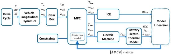 The Adaptive MPC controls the nonlinear HEV model with a standard linear MPC whose prediction model is updated at every time step . To update the linear MPC, the HEV model is linearized at every time step and the linear parameters are used to update the parameters of the MPC prediction model. The linearized model is obtained by computing the Jacobian matrix at each time step. The stability and disturbance rejection properties for this approach are addressed in the literature in [54,55]. The linearized model is computed according to Equation (18).
