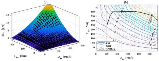 (a) Fuel consumption map of Mazda CX9 2016 ICE as a function of and . The dots are the estimated values. (b) The maximum operating torque as a function of and the fuel consumption rate contour lines.