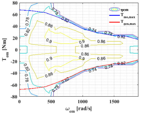 Efficiency map of the electric machine in both motor and generator operating modes. The maximum motor torque and maximum generator torque as functions of .