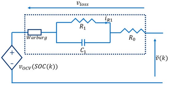 The electro-thermal model of the lithium cell was developed and validated experimentally at an ambient environmental temperature in [17]. The equivalent circuit of the electric model according to [47] is shown in Figure 5. The circuit consists of a single parallel resistor-capacitor (RC) branch connected in series with a resistor and a Warburg impedance. Given a current input (derived from the battery power request ) to the cell model, the diffusion–resistor current passes through the parallel resistor. The single parallel RC branch with and models the relatively high-frequency diffusion loss due to mass transfer and the activation loss due to charge transfer. models the ohmic internal resistance of the cell. The low-frequency Warburg impedance models the hysteresis losses [48].