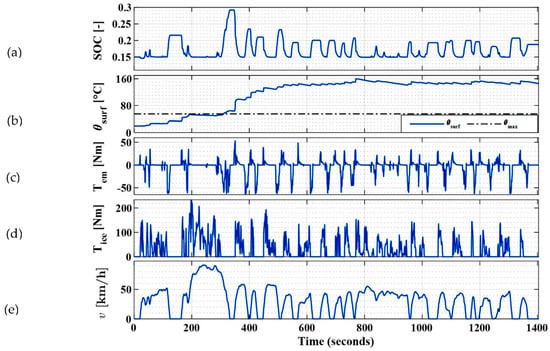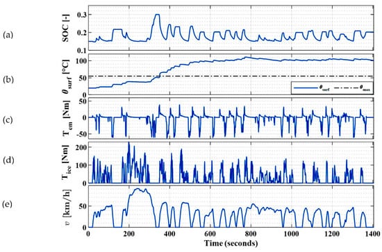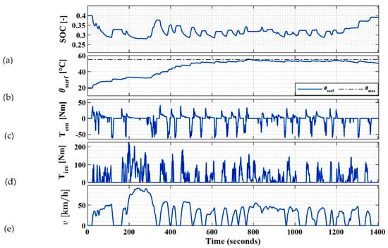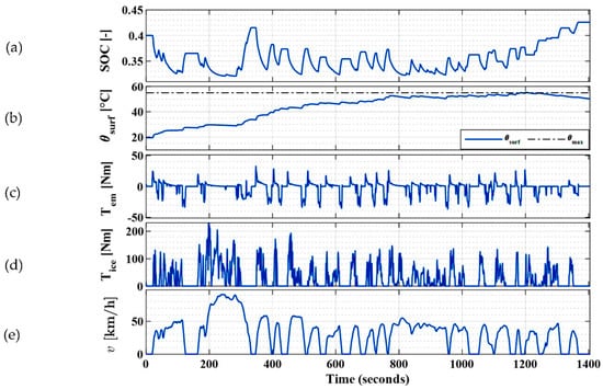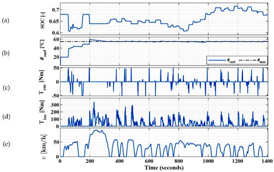 MPC evaluated with using 14s6p battery configuration, applied thermal limitation; (a) is the state of charge; (b) is the battery surface temperature; (c) is the EM torque; (d) is the ICE torque; (e) is the velocity of the UDDS drive cycle.