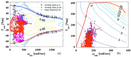 Operating torque comparison between the case with thermal limitation and without thermal limitations in the efficiency map. (a) The electric machine torque comparison; and (b) the ICE torque comparison.