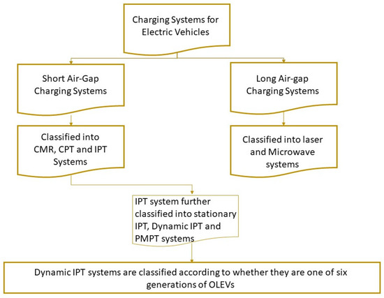 General Classification of EV Charging Systems (Adapted from [9]). CMR—Coupled Magnetic Resonance; CPT—Capacitive Power Transfer; IPT—Inductive Power Transfer; PMPT—Permanent Magnet Power Transfer; OLEVs—Online Electric Vehicles.