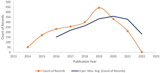 Document Count Trend. The three-period moving average depicts the true trend of record against the publication year.