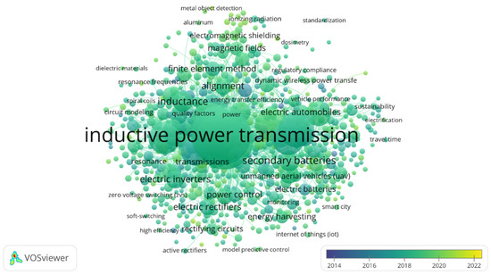 Keyword co-occurrence networks are static depictions of the studied topic that do not take into account changes over time. VOSviewer, on the other hand, uses a time zone viewpoint to depict each node by the average year in which the keyword was used in literature. The evolution of WPT application in the EV industry has continued at a decreasing rate in recent years, as shown in Figure 4. General terms like “inductive power transmission”, “wireless charging”, “electric power systems”, and “electric vehicles” are all represented in the middle of the spectrum (around 2018). This outcome could be attributable to a focus on such themes during that time period (2014–2022) or to the fact that the topic was thoroughly explored over that time period. The most recent study subjects were “object detection” and “shielding effectiveness” possibly signaling a shift in the research focus in this field. Earlier contributions considered the various WPT as a viable target area of application for wireless charging applications; however, later publications focused on more specific problems in inductive power transfer and electromagnetic shielding effects for safety, with the other WPT methods and technologies relegated to second place. Keywords relating to novel methodologies, such as “compensation topology” or “internet of things”, were the exception.