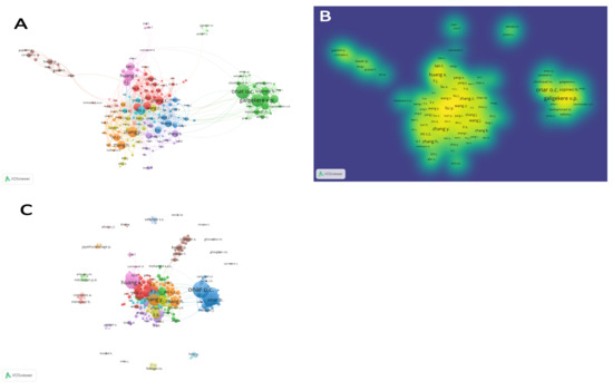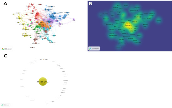Largest set of connected items for network (A) and visualization density (B) of author co-authorships. This network and visualization density map ((A) and (B) respectively) depicted the 163 items with 844 links and 11 clusters. 202 out of 3074 authors met the criteria of at least five documents to be published by an author and minimum citations was set at zero. The network (C) depicted some clusters/items that were not connected.