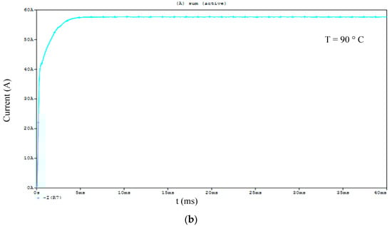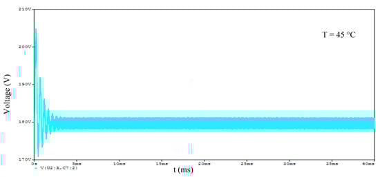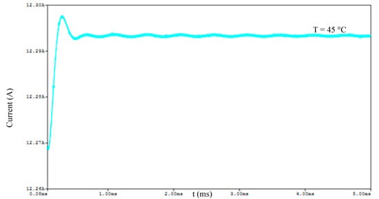 Figure 7, Figure 8, Figure 9 and Figure 10 represent, respectively, the voltage and the current of the output of the chopper for a temperature of 45 °C and 90 °C.