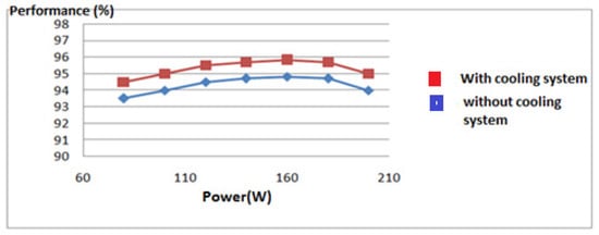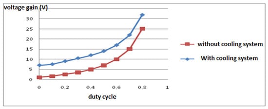Figure 14 shows the efficiency with and without a semiconductor cooling system. In addition, Figure 15 shows the voltages gain of our interlaced DC/DC converter with and without a cooling system. From these two figures we can see that a semiconductor cooling system would improve the results of the studied system.