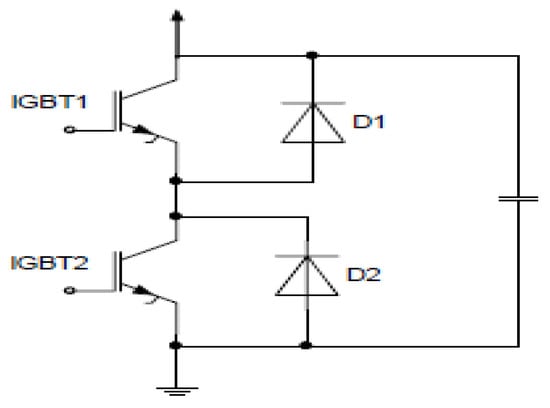 A thermal model has been developed for a “600V/20A” IGBT chip. We are interested in the temperature of the component. In this step, we focus on an inverter arm with two IGBTs and two diodes on a substrate. The IGBT chips and diodes are from the Mitsubishi Power Semiconductor. Figure 19 illustrates the electrical diagram of the module used.