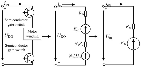 where is the drive motor voltage, V; is the number of series switches; is a single constant tube voltage drop, V; is the bus voltage, V; is the equivalent resistance of the drive motor, Ω; is the equivalent resistance of the motor power bridge, Ω; is the internal resistance of the motor, Ω; is the instantaneous current, A; and is the back electromotive force (BEMF) of the equivalent circuit, V.