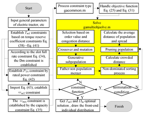 The design constraints of PTN and are introduced into Equation (44) to obtain the constraint equation of , and the constraint of the motor speed regulating ability is introduced into Equation (36). Then, the design constraint of is established. From the Sheffield University MATLAB GA toolbox, the two functions that are gacommon.m and gamultiobjsolve could easily be called [27]. Through gacommon.m processing constraint types, the boundary conditions are established. The global solution of heat loss objective Equation (26) and transmission efficiency objective Equation (32) is carried out by gamultiobjsolve. Afterward, the fitness function deviation is determined, and the individual front-end distribution of the solution set of and is solved; the optimal solution is selected as the design value of traction motor parameters. The drive motor is calculated according to Equation (21). Finally, in accordance with the electric tractor’s bus voltage of the drive motor is set, and the other intrinsic parameters of the drive motor are calculated by Equations (14) and (21).