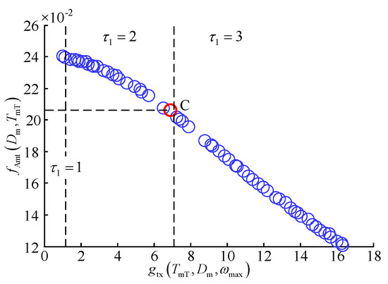 Figure 4 shows the individual front-end distribution of the parameter set of the drive motor of the electric tractor. On the basis of Equation (29) and objective function Equation (32), when the value of τ1 is the same, the total efficiency of the electric tractor drive system is the same. From Equation (30) is established, and is substituted. The figure shows that when τ1 = 1, the heat loss of the drive motor is high; when τ1 = 2, and has a nonlinear inverse relationship. In the solution set of τ1 = 2, a large corresponds to a slight heat loss. The design values of the motor parameters are calculated by , , and corresponding to the individual point C.